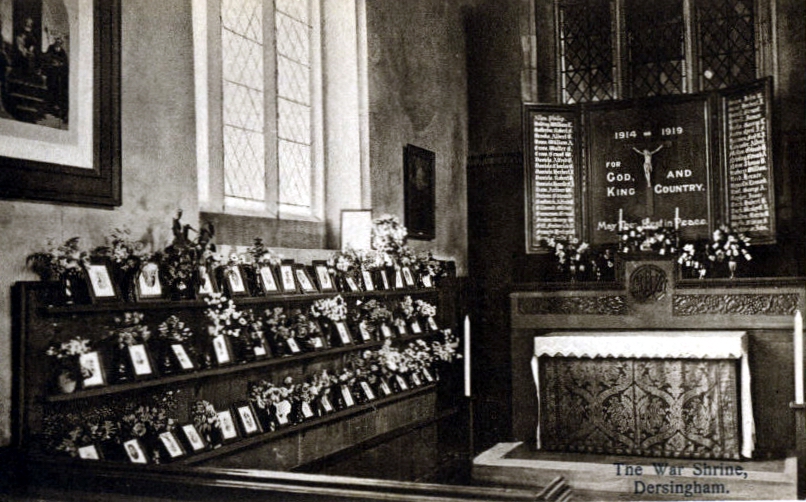 The report continued, “The North wall of the church has been panelled with oak 5 feet high and on narrow ledges are the portraits of the fallen with vases and flowers placed there by relatives.” (see the photograph at the end of this article)